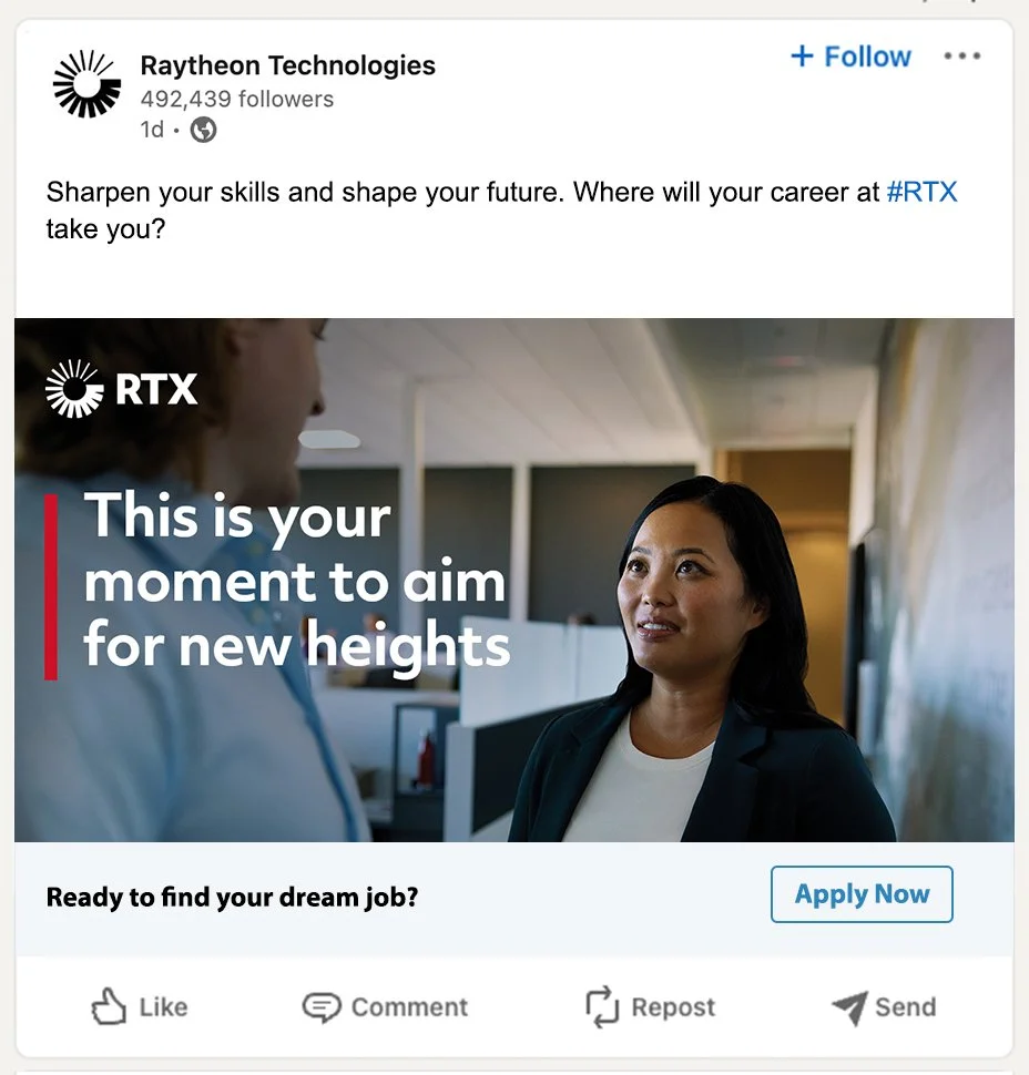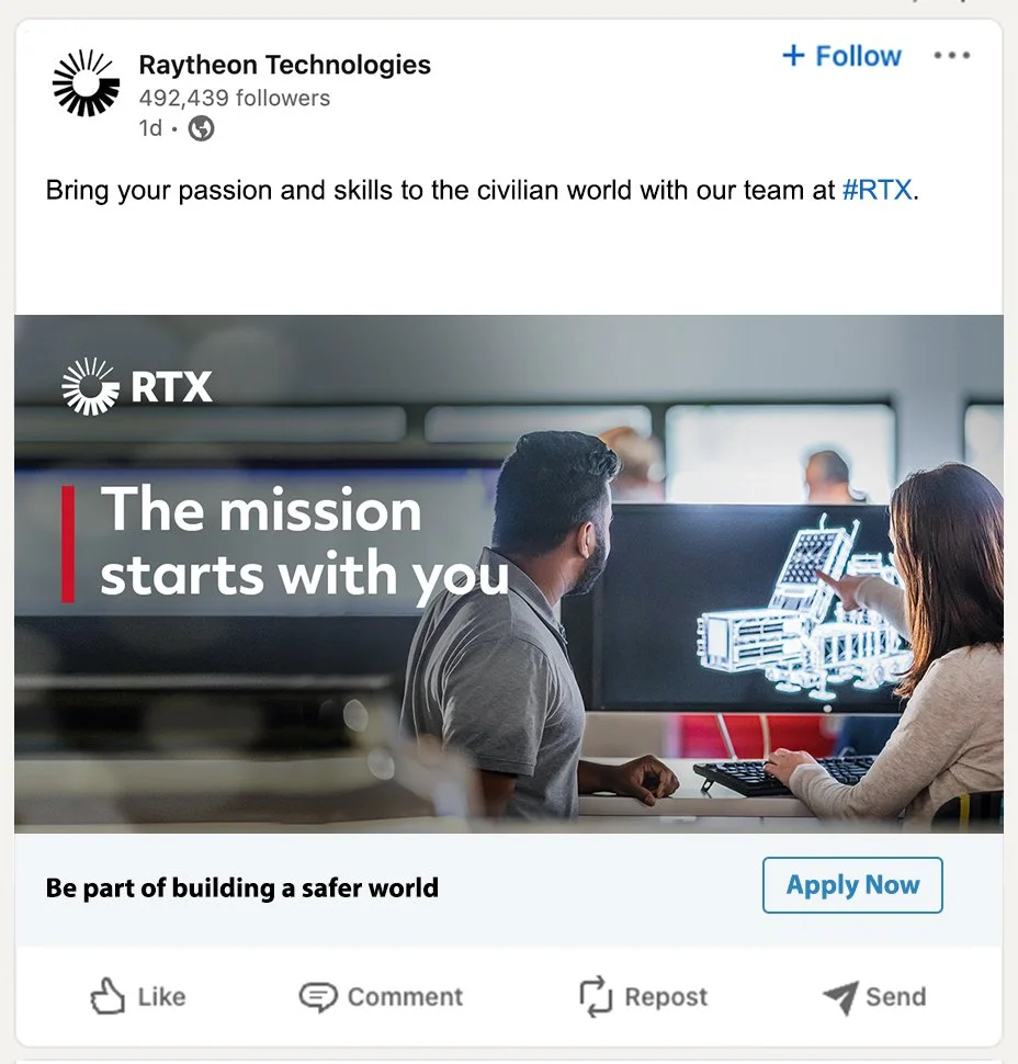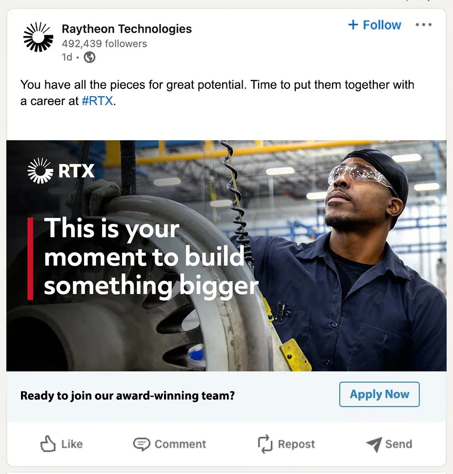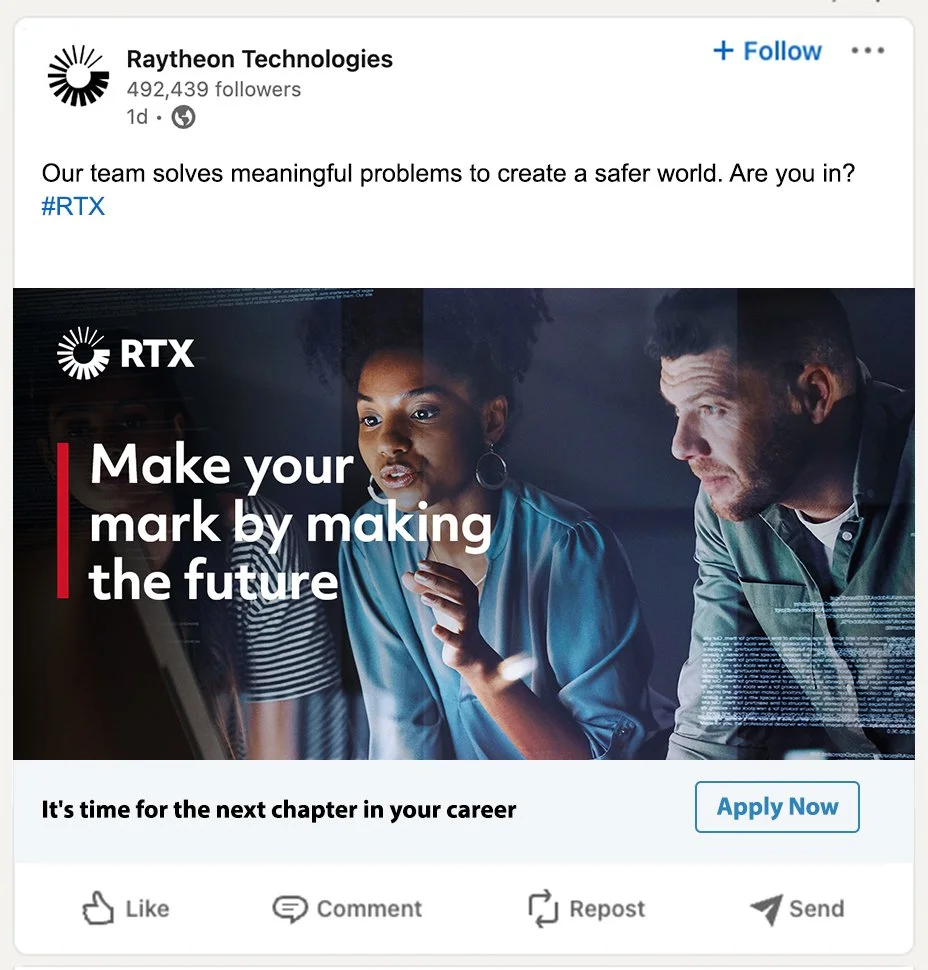 Encouraged potential candidates to apply for positions on the RTX careers site, with LinkedIn as the primary channel, while also testing Facebook and Instagram. Target audiences included engineers, manufacturing workers, military members, early-career professionals, and college interns.